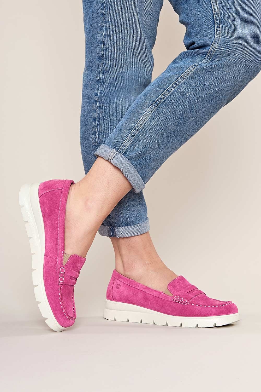 The Moshulu Fuchsia Suede Moccasin Loafer Trainers is ideal for casual, everyday, evening.