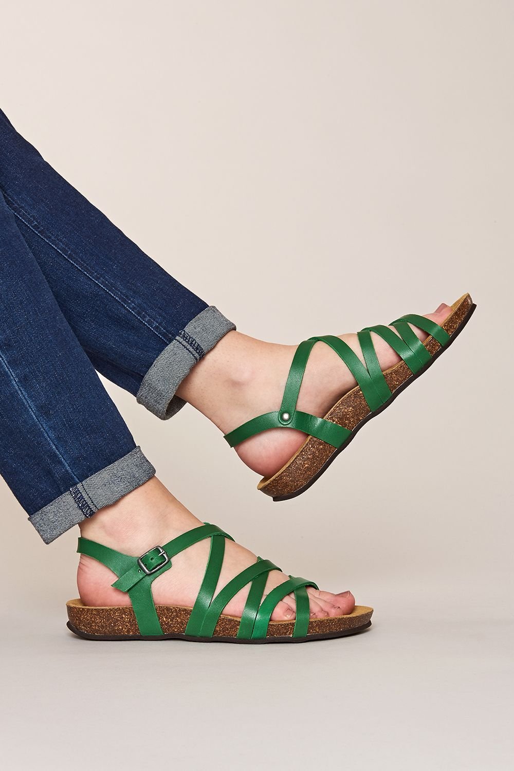 Comfortable green strappy sandals with a cork footbed and suede underfoot. Perfect for spring and summer, these sandals offer a flexible and cushioned feel.