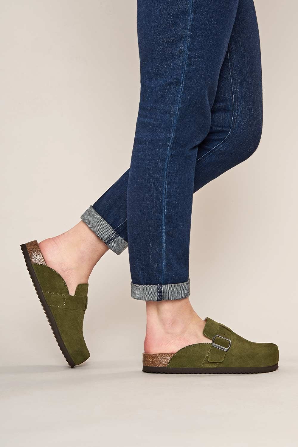 The Moshulu Women's Green Suede Clogs with Cork Footbed is ideal for casual, everyday.
