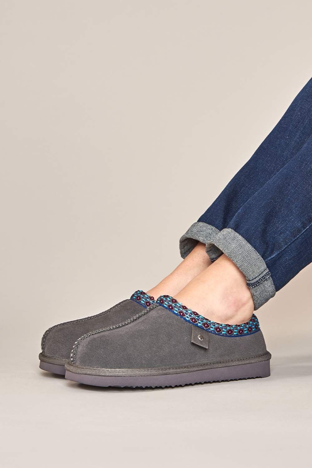 The Moshulu Women's Grey Suede Sheepskin Slippers is ideal for casual, everyday, relaxed.