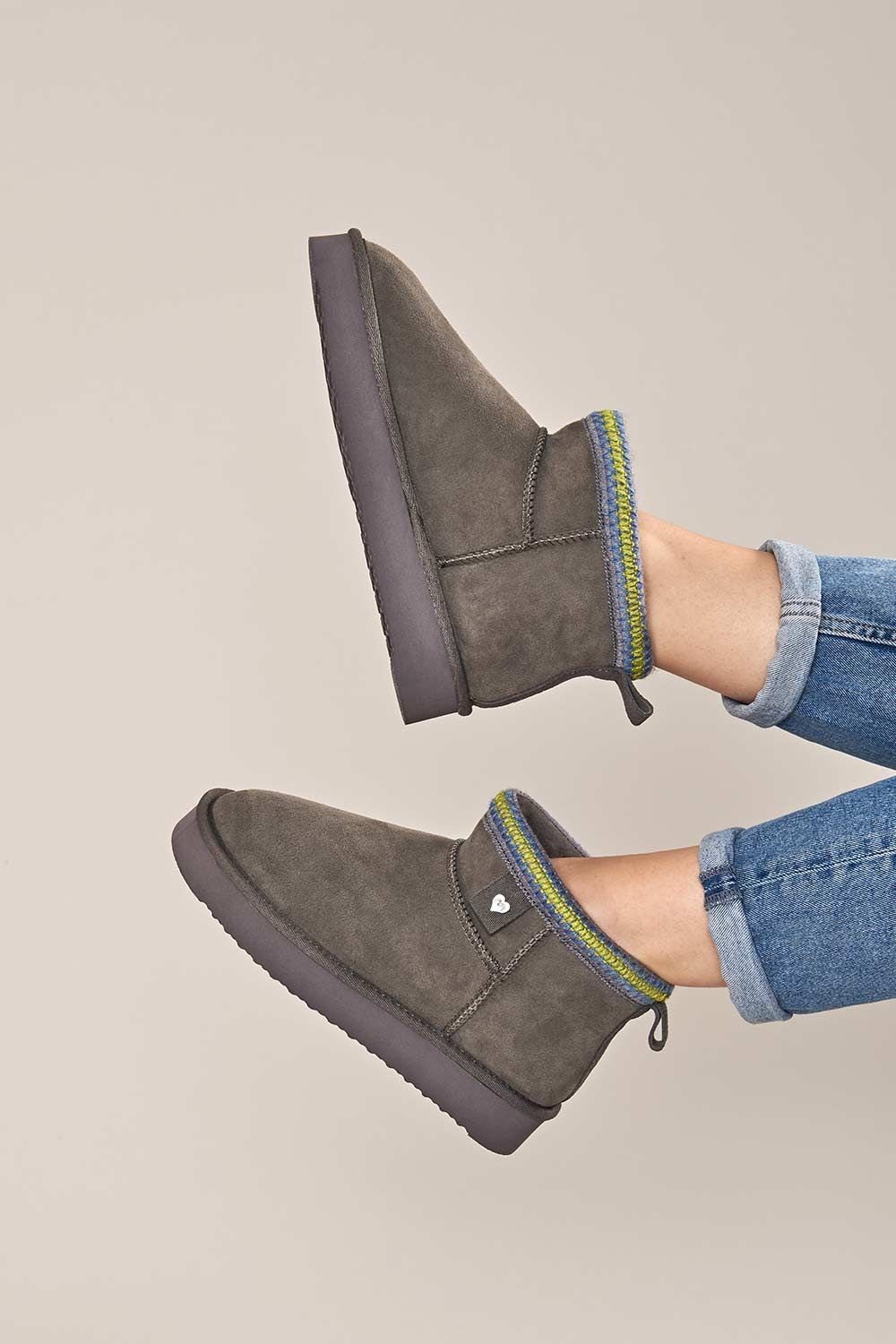 Cozy grey sheepskin bootie slippers with a plush interior and cute decorative collar. The soft sheepskin moulds to your feet, and the lightweight EVA sole provides comfort. Perfect for chilly days.