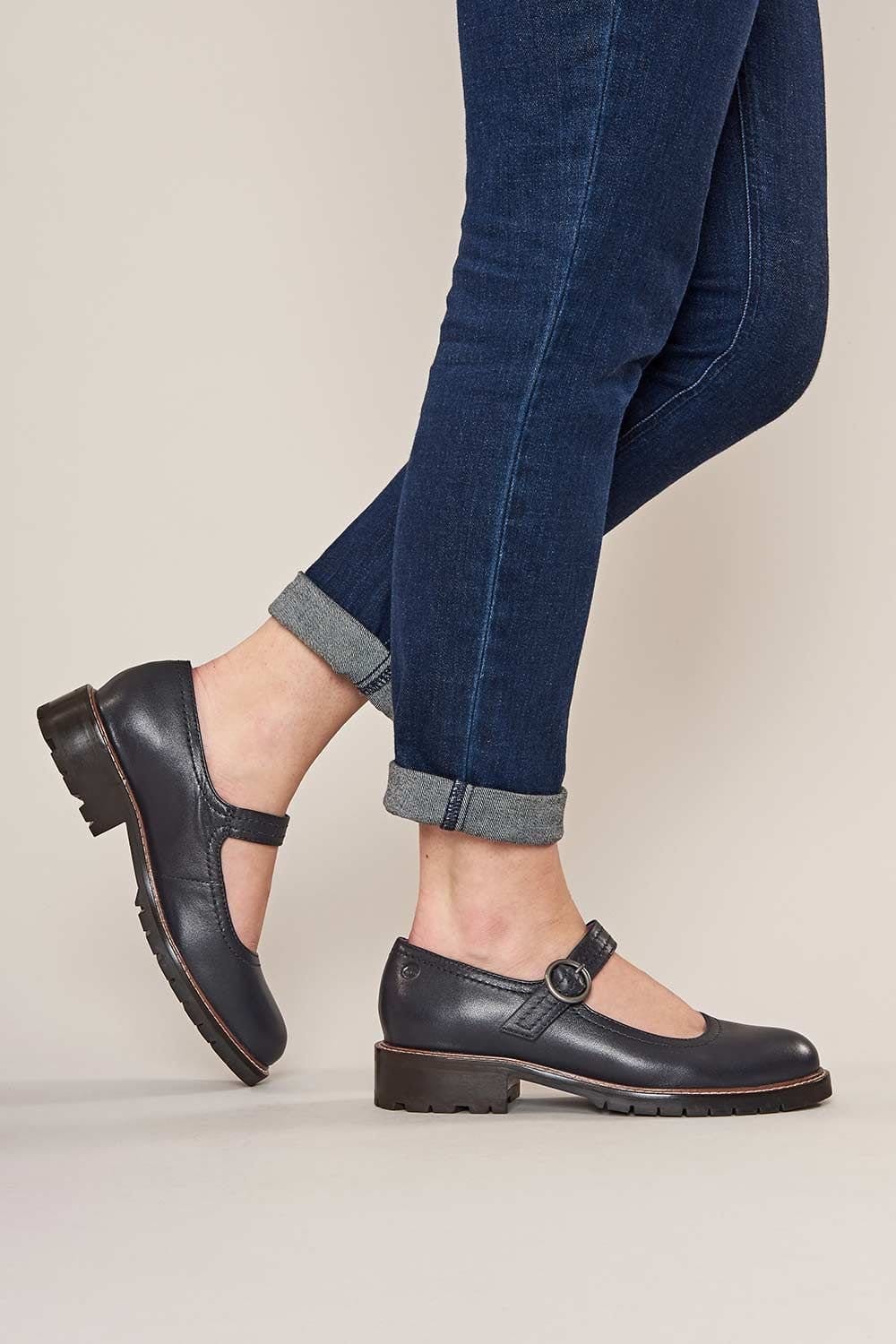 Stylish Mary Jane shoes by Moshulu in indigo suede. Featuring a flat sole and almond toe, these shoes offer a perfect blend of comfort and elegance. Ideal for everyday wear.
