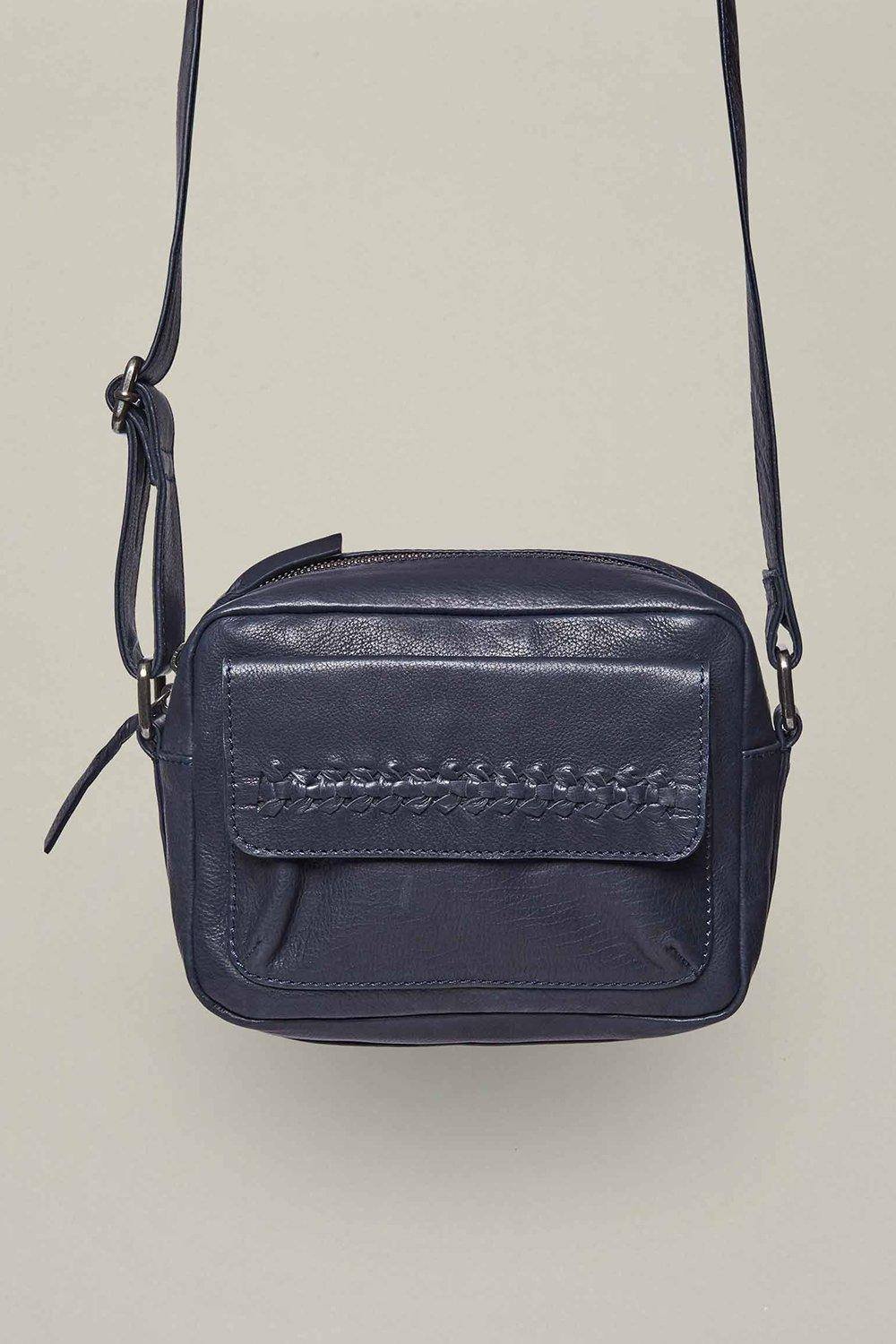 Elegant Indigo leather crossbody bag with a boxy style inspired by vintage camera bags. Features a long adjustable strap for versatile wear, and a braided detail on the front flap for a touch of texture.