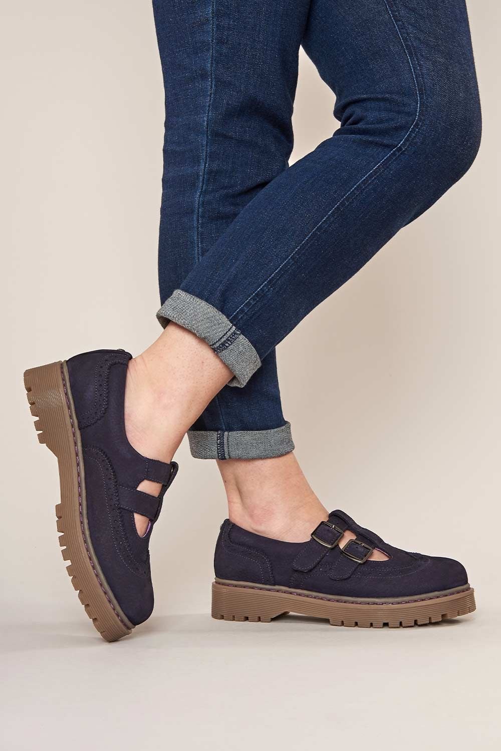 Stylish Indigo nubuck Mary Jane shoes with a chunky sole and double buckles. Featuring brogue detailing and a padded leather-lined insole for comfort.