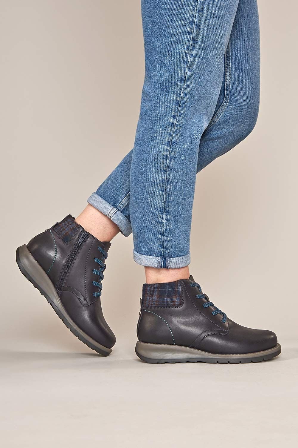 Stylish indigo lace-up ankle boot from Moshulu. Features a blend of waxy leather and a cosy wool-blend collar. Equipped with a bouncy Nightjar sole and a dual-fit footbed for a perfect fit. Ideal for everyday adventures.