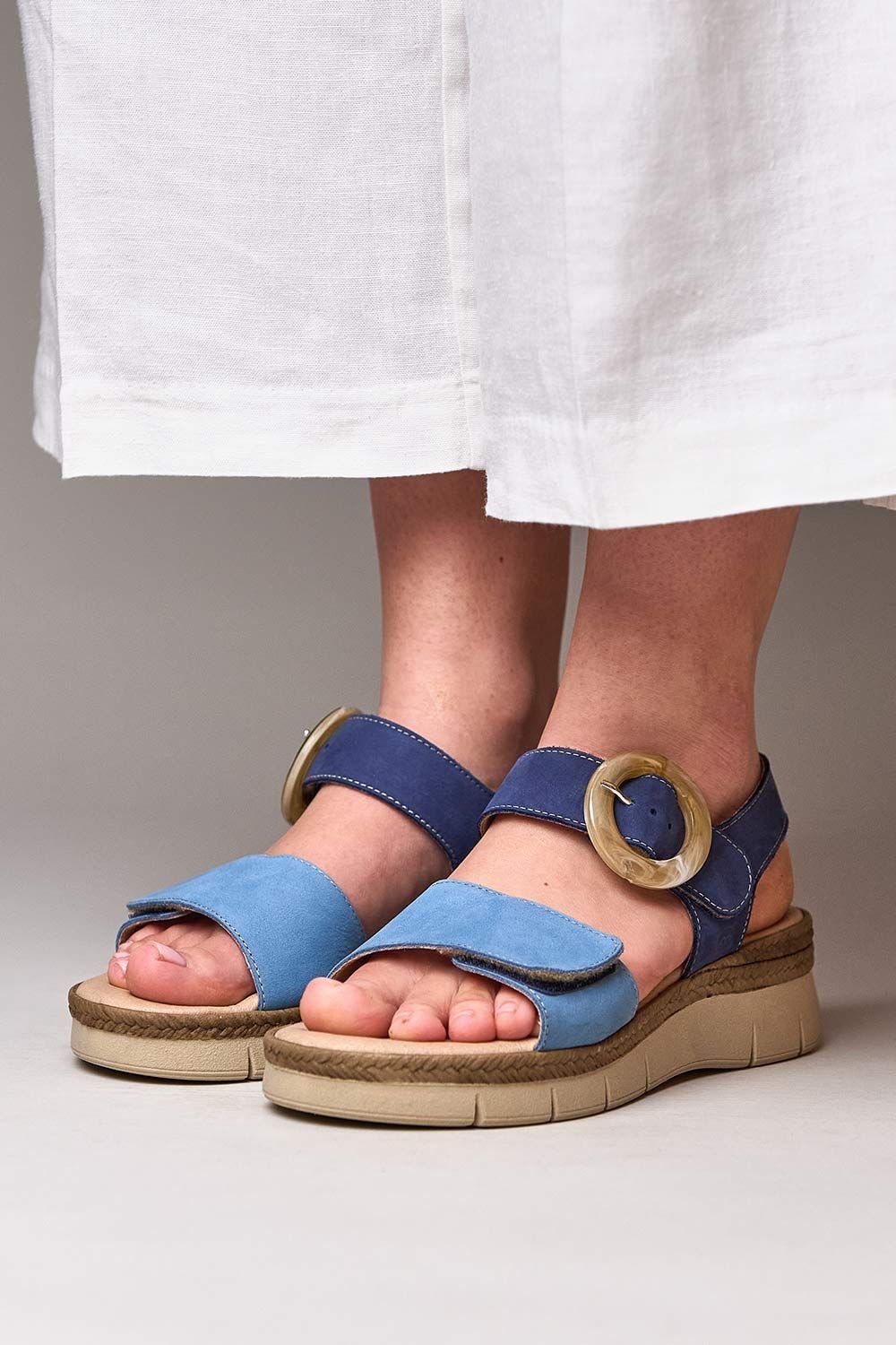 Stylish indigo nubuck sandals with a flexible, grooved sole and cushioned platform. Featuring two-toned nubuck and espadrille-inspired details, these sandals are easy to slip on and secure with two touch-fastening buckles.