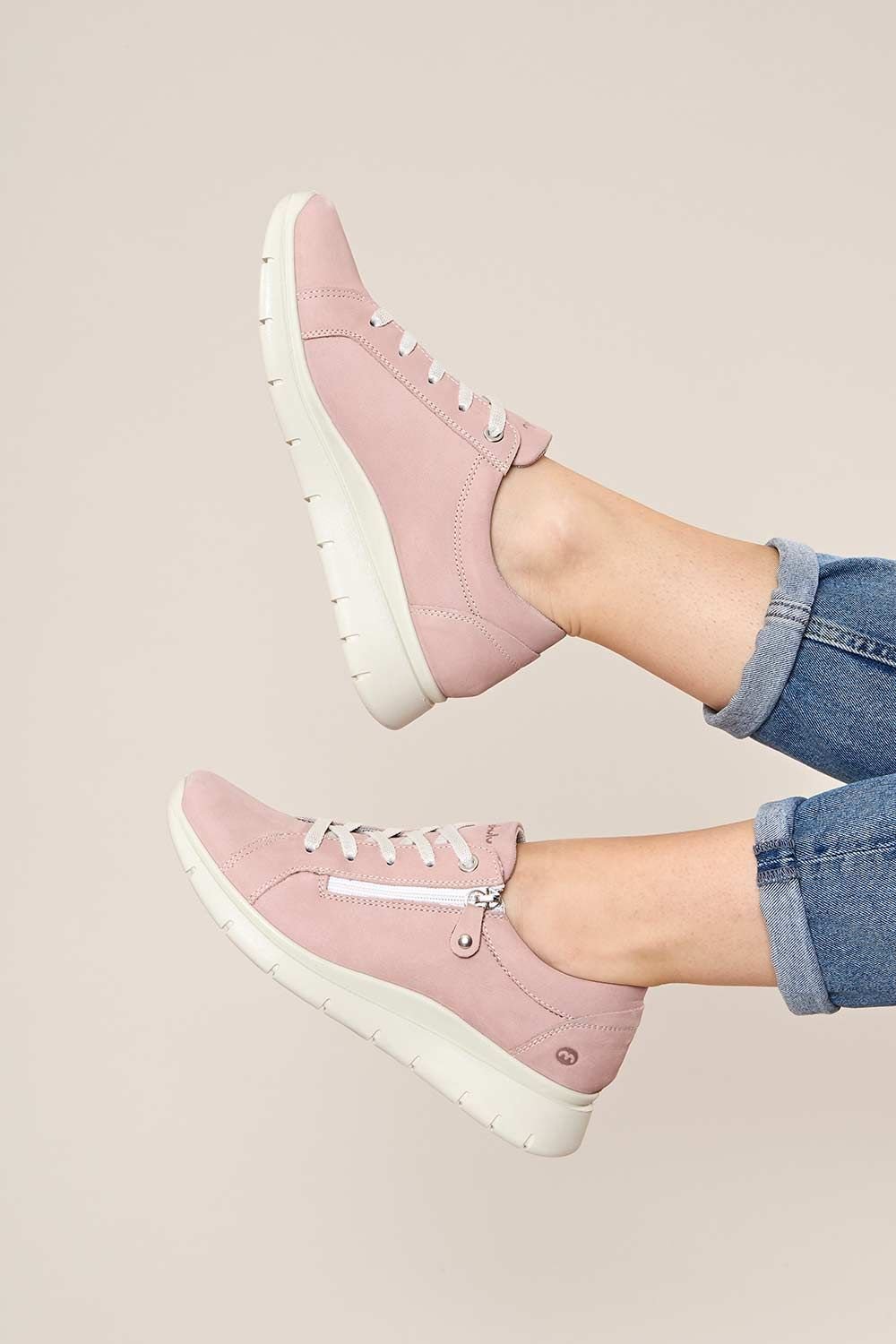 Lightweight trainers in light pink featuring a handy side zip, cushioned footbed, and extra padding for all-day ease. The removable insole ensures a snug fit, making them effortlessly stylish and secure.