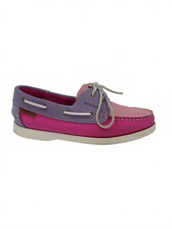 These Moshulu Women's Boat Shoes feature a pink and purple leather upper with a slip-on closure and round toe shape. Designed for all seasons, they offer nubuck material, leather lining, and a rubber outsole for durability and a trendy look.
