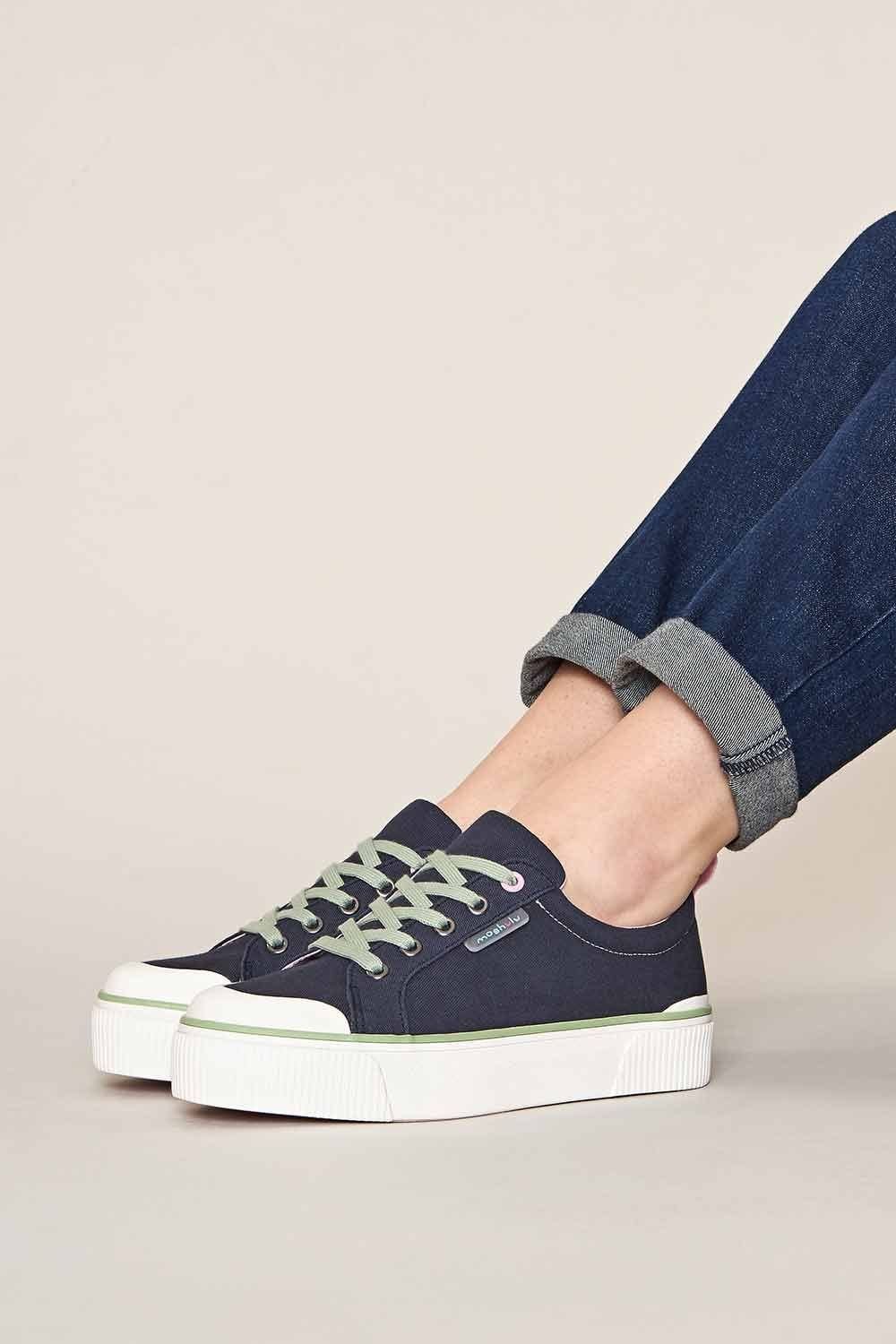 Refresh your wardrobe with these chunky navy trainers from Moshulu. Crafted from breathable cotton canvas, they offer all-day comfort with a hidden heel wedge for a subtle lift. The playful green laces add a fun touch to this versatile pair.
