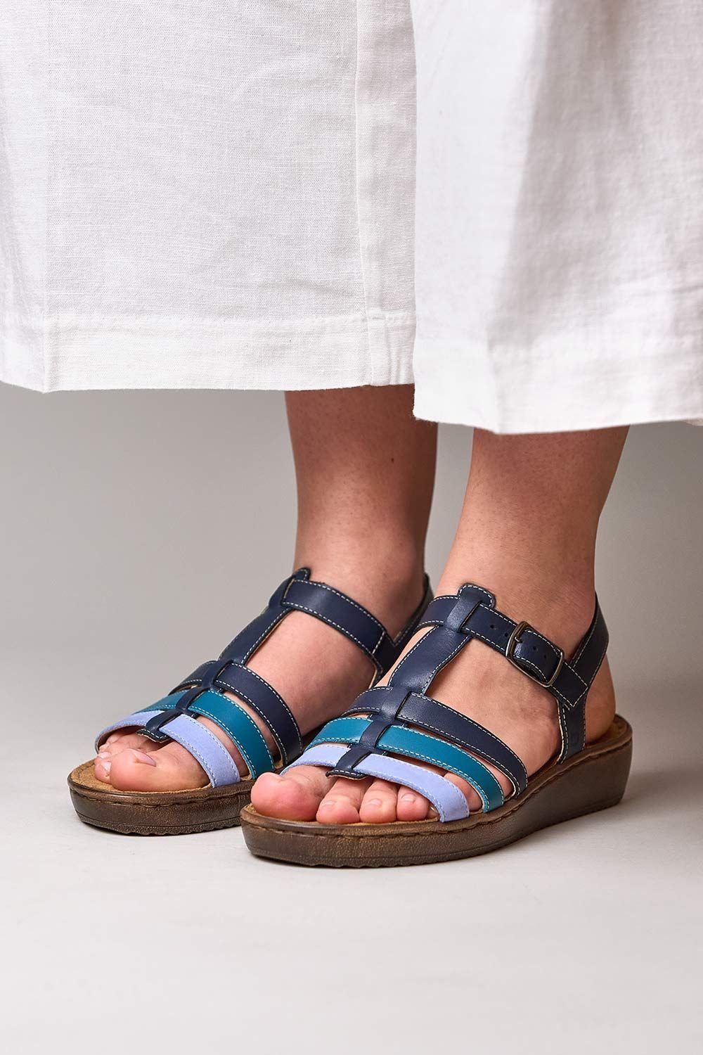 Stylish Navy leather strappy sandals by Moshulu. Featuring a flexible wedge and a multi-strap design for added support, perfect for sunny adventures.