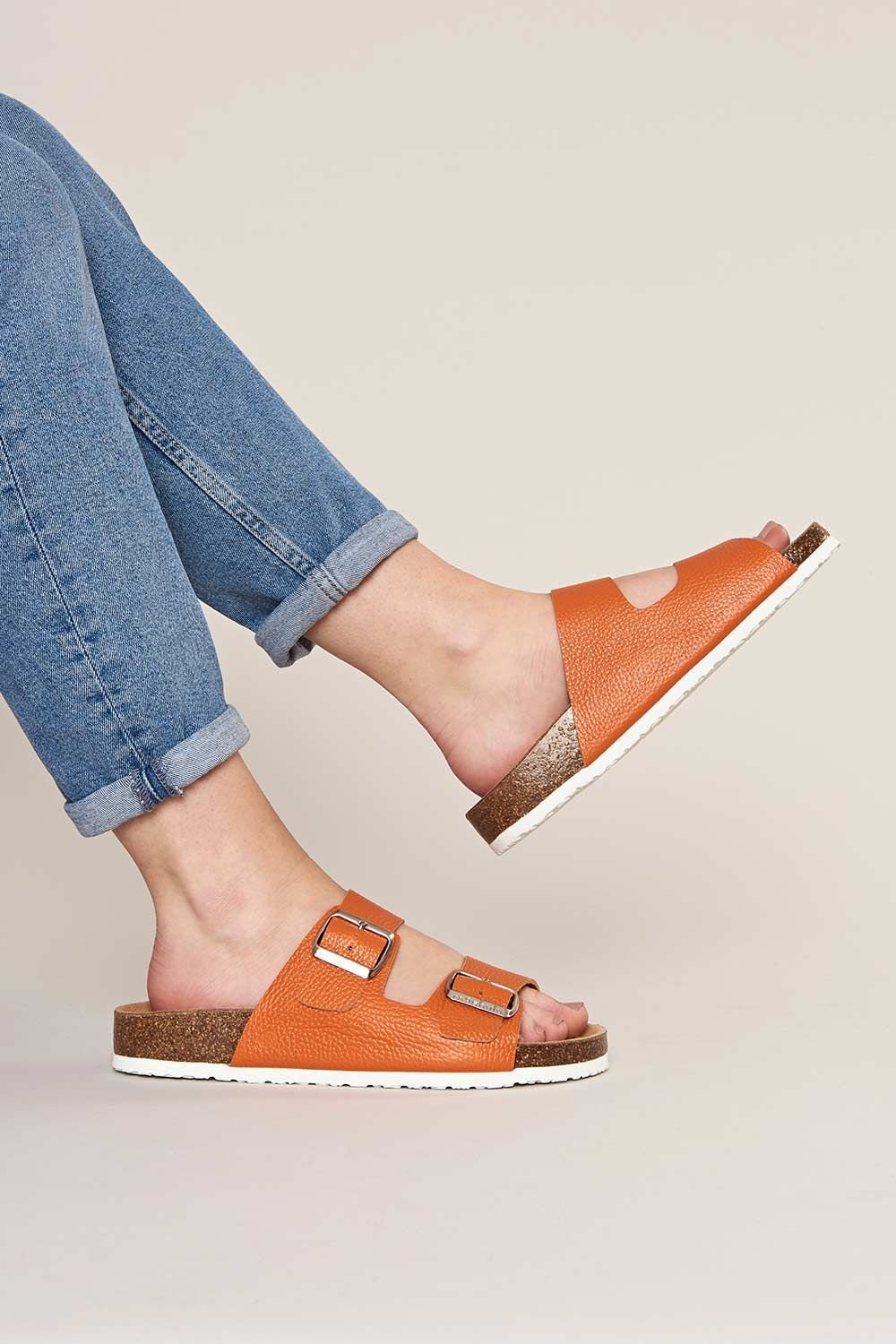 The Moshulu Women's Orange Leather Sandals with Cork Footbed is ideal for casual, beach, city strolls.