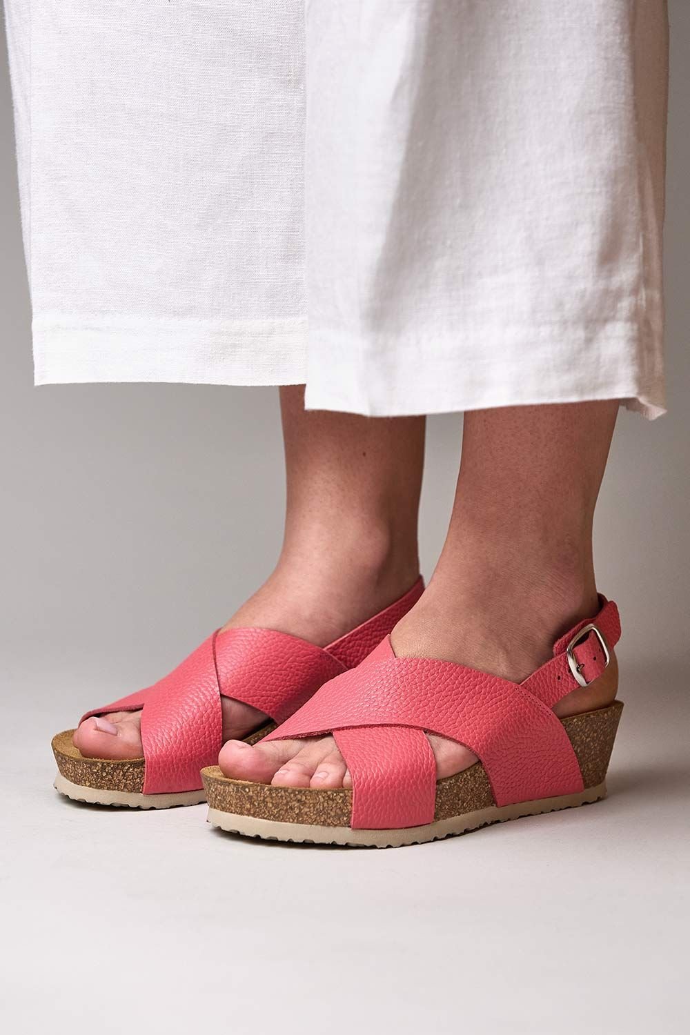 Stylish Raspberry leather cross-over wedge sandals by Moshulu. Featuring a cork footbed for comfort, milled leather straps, and a cushioned suede sock. Ideal for sunny days with a lightweight EVA sole.