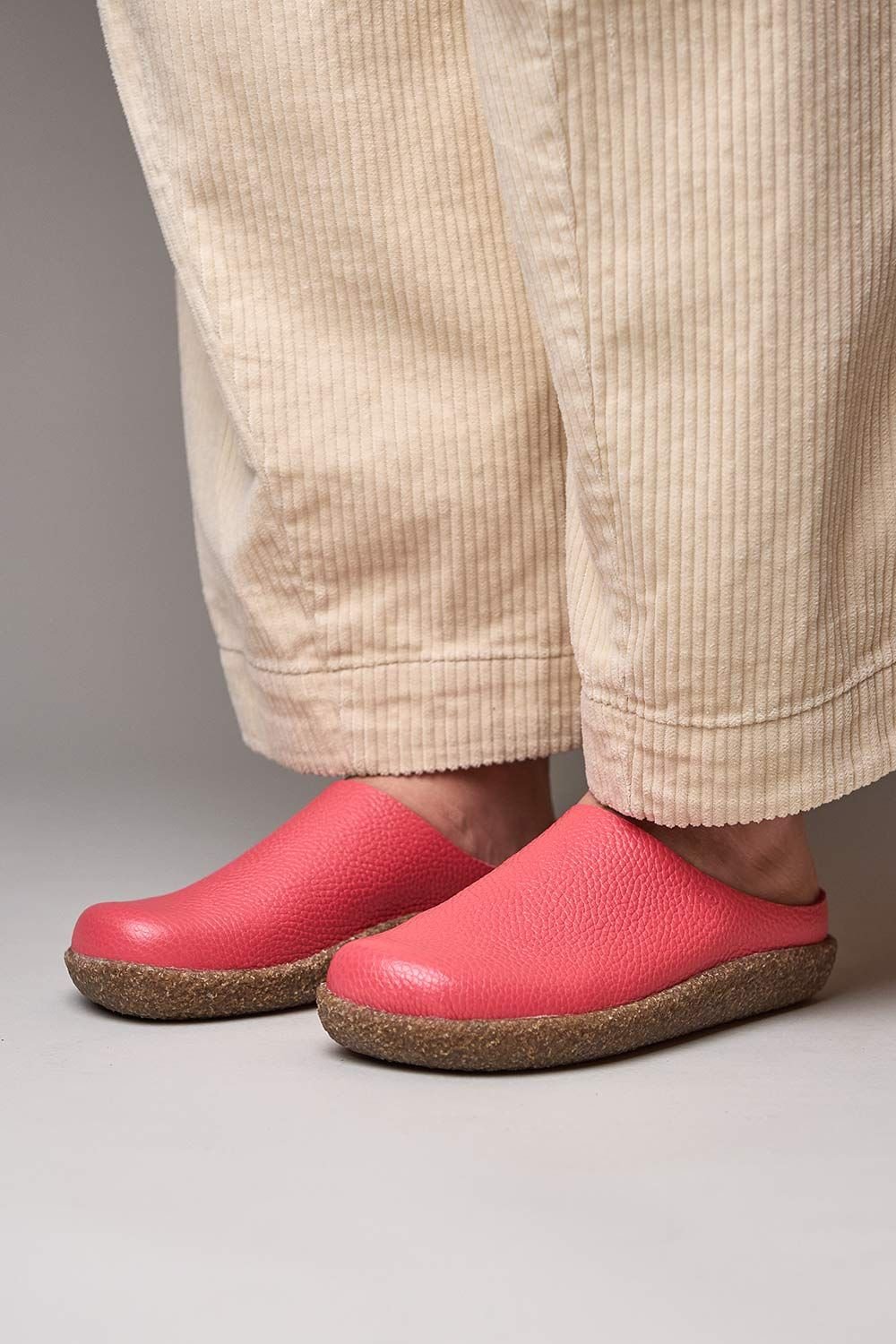 Contemporary Raspberry leather clogs by Moshulu. Crafted from soft, natural-textured leather, these unlined mules offer a casual yet stylish look. Perfect for everyday wear with their slide-in design.