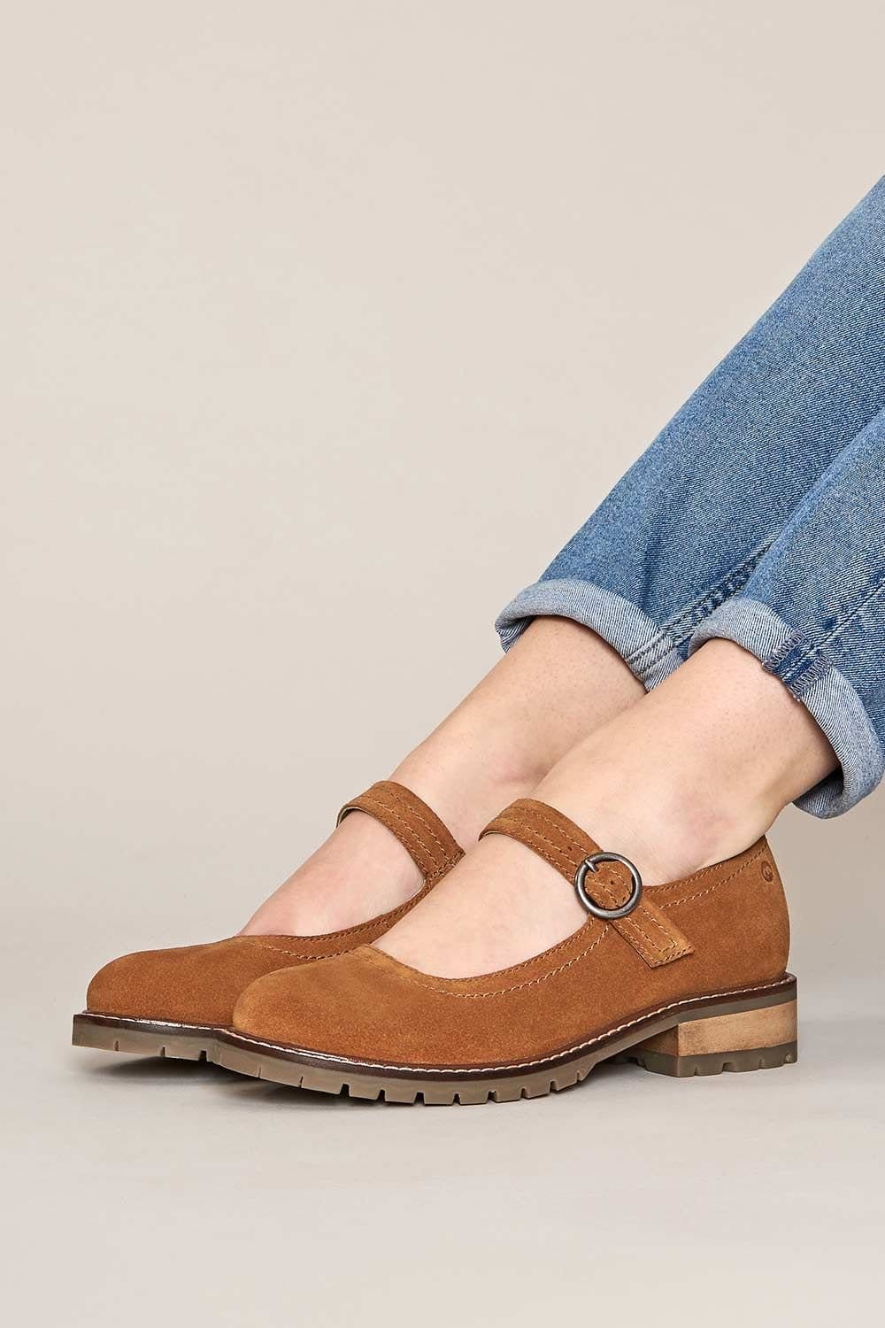 The Moshulu Tan Suede Mary Jane Shoes for Women is made from suede, leather.