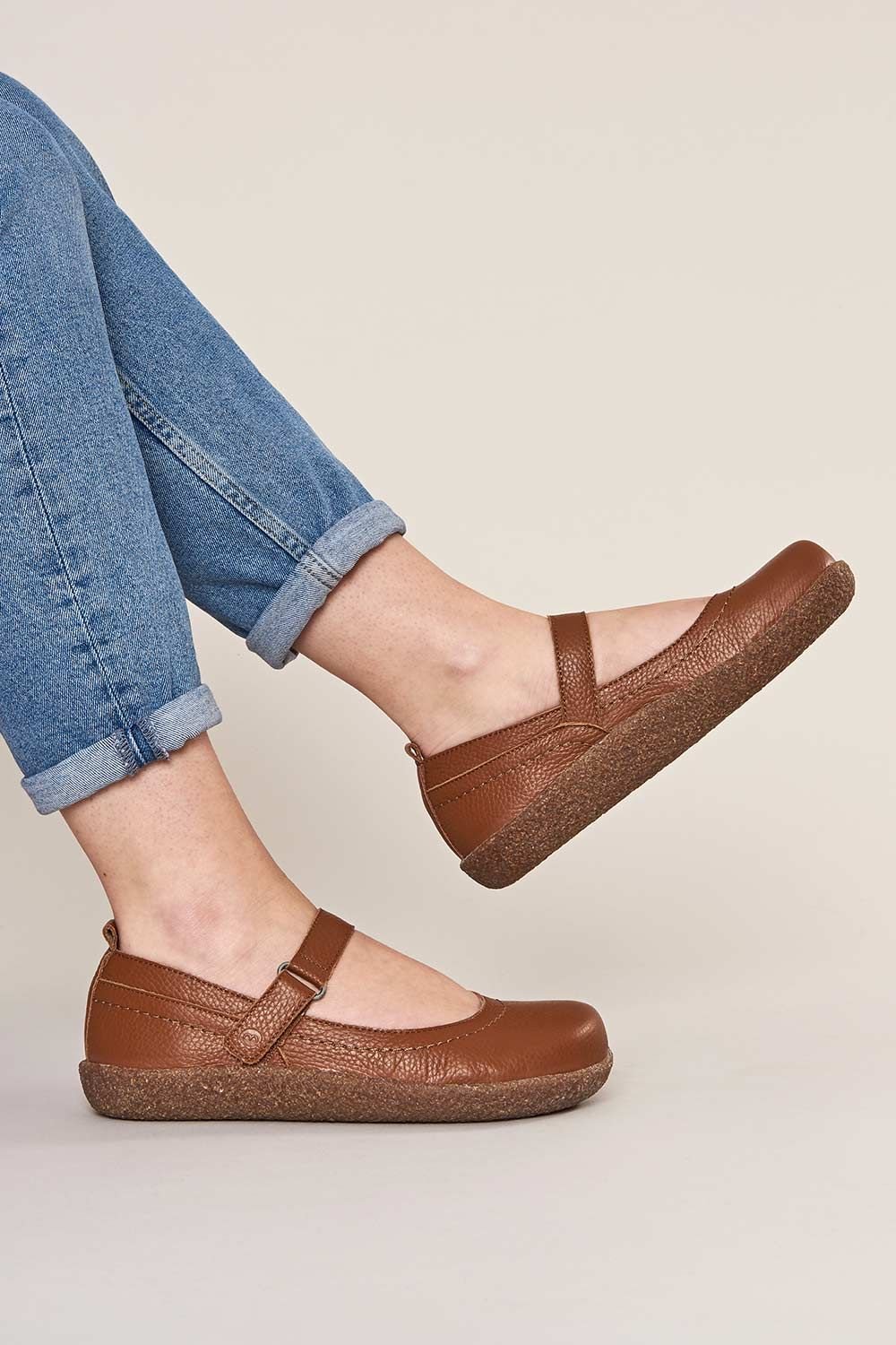 Stylish Mary Jane-inspired shoes in tan leather with a velvet suede insole for comfort. Features a flexible rubber sole and an adjustable touch fastening for a secure fit. Ideal for everyday wear.