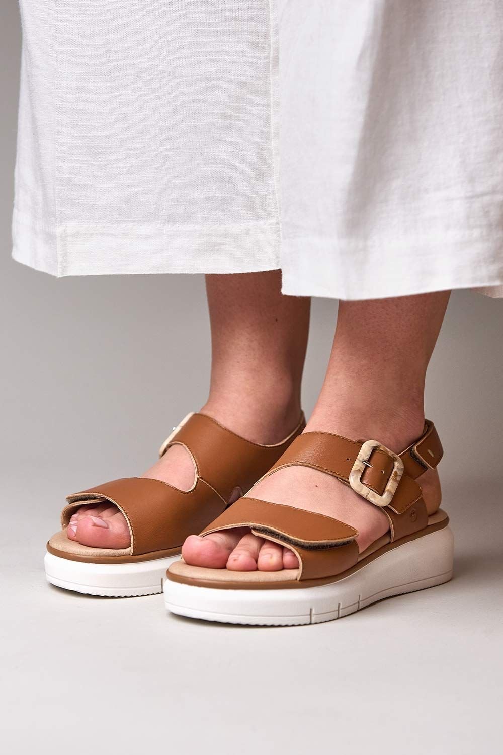 Stylish tan leather platform sandals with a cushioned, bouncy sole and marble-finish buckle. Featuring triple adjustments for a perfect fit, these sandals are perfect for any summer occasion.