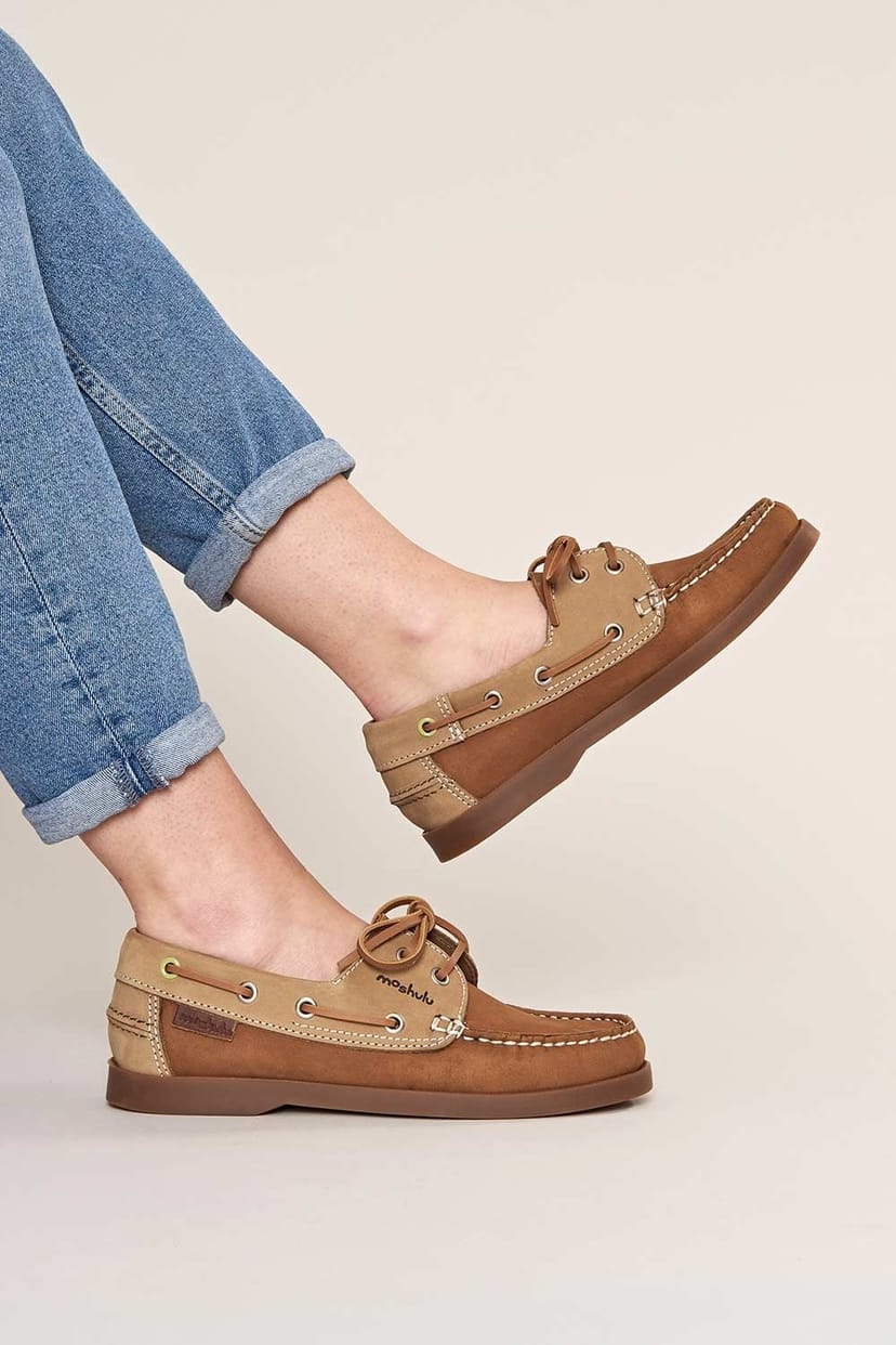 The Moshulu Tan Leather Boat Shoes for Women is made from leather.