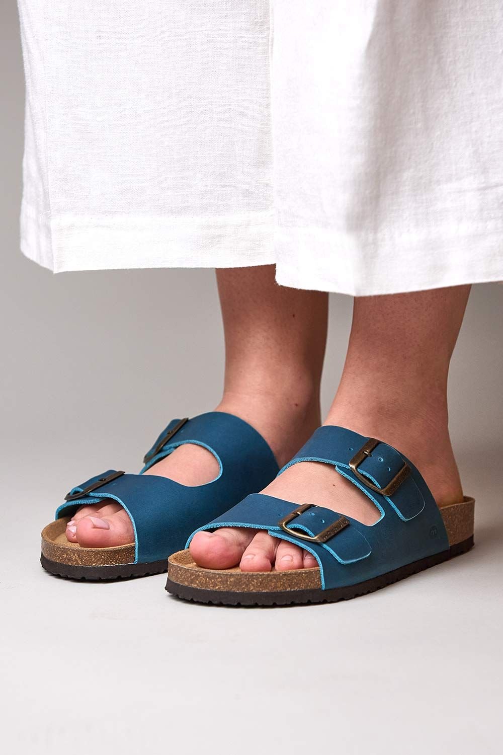 The Moshulu Teal Suede Sandals with Cork Footbed is made from suede.