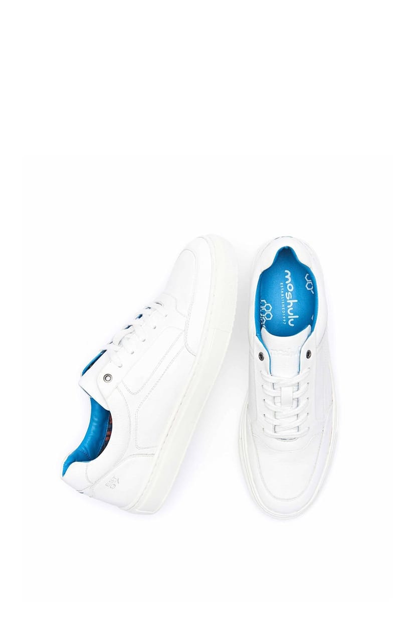 Stylish white leather casual trainer by Moshulu. Features a cushioned sole, padded tongue and collar, and lace-up closure for a comfortable fit. Ideal for everyday wear.