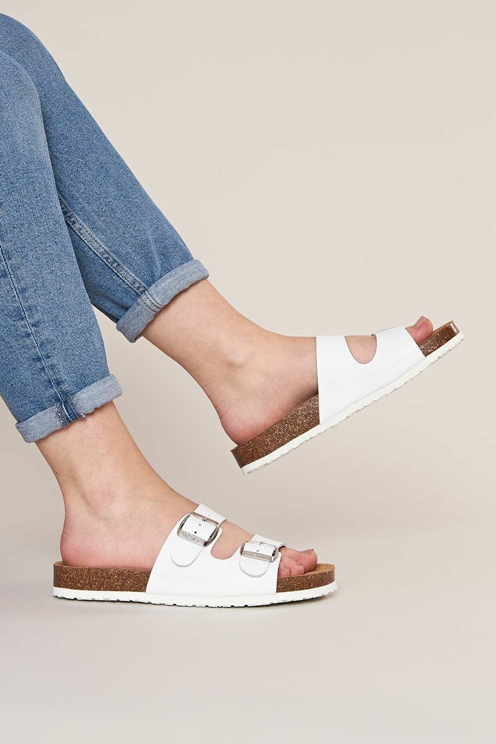 Stylish white leather mule sandals with a contoured cork footbed for all-day comfort. The lightweight sole and adjustable buckles add to the ease and versatility of these sandals.