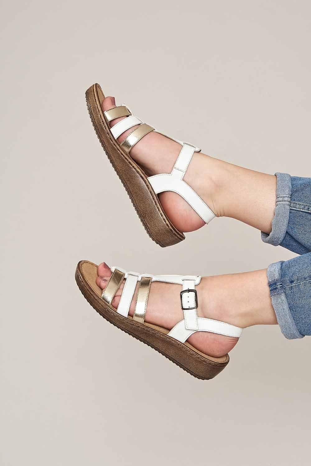 Stylish white platform wedge sandals by Moshulu. Featuring a multi-strap design with a mix of leather and nubuck, these sandals offer both style and comfort. Ideal for sunny days and casual outings.