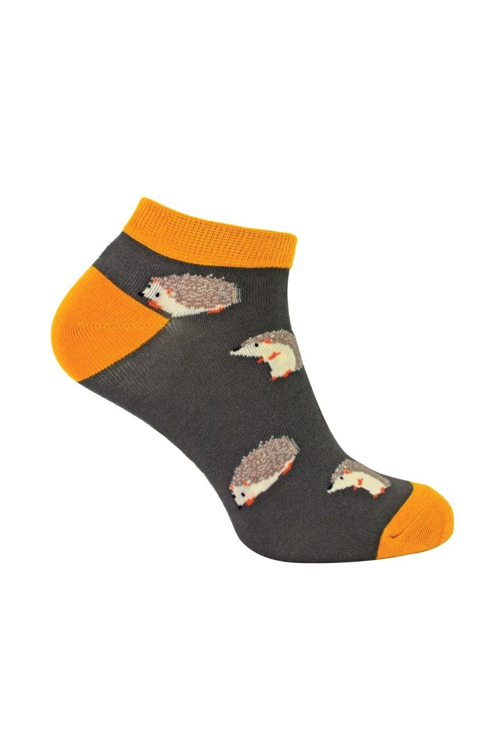 Fun and quirky Mr Heron men's trainer socks featuring a hedgehog design. Made from a blend of cotton, polyester, and elastane for comfort and durability. Ideal for adding a touch of novelty to your summer footwear.