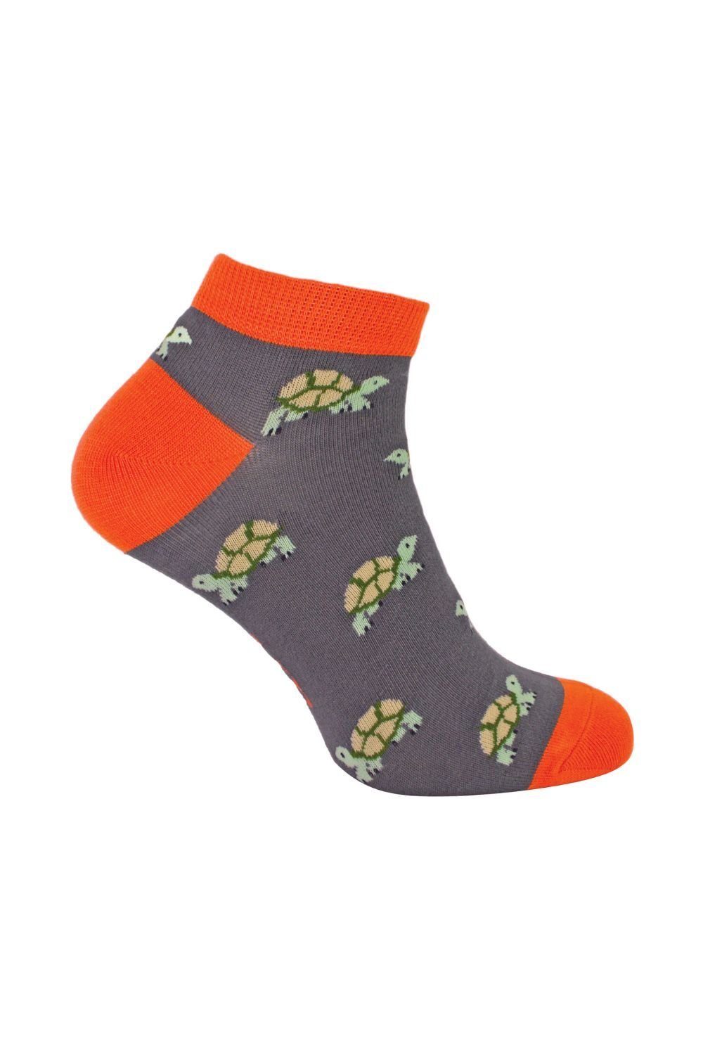 Novelty bamboo trainer socks with a grey base and orange trim. Featuring a playful turtle print, these socks are perfect for adding a fun touch to your summer outfits.