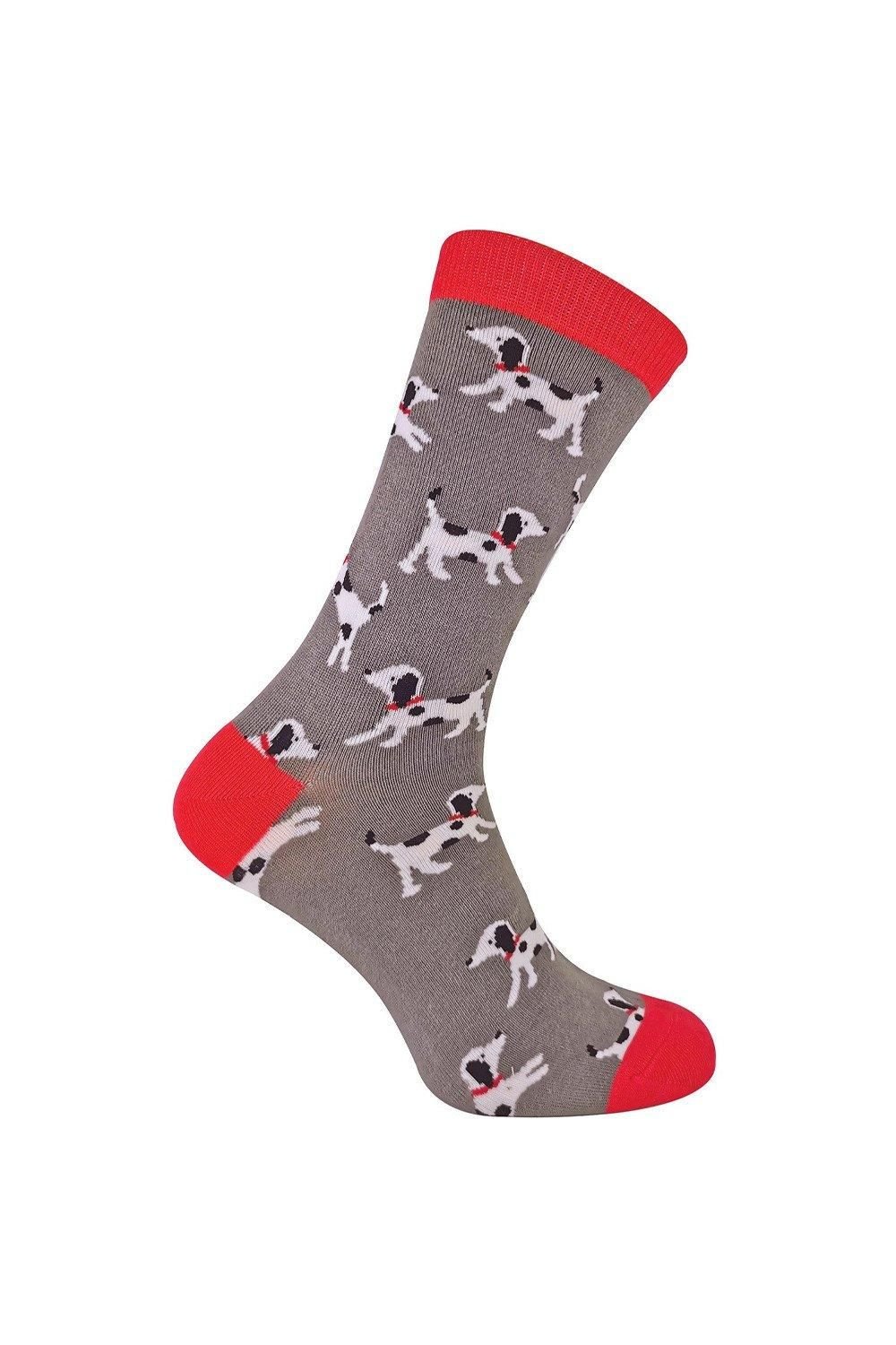Cute novelty socks for dog lovers, featuring a grey base with playful Dalmatian dog patterns. Made from a soft breathable bamboo blend, these socks are perfect for everyday wear.