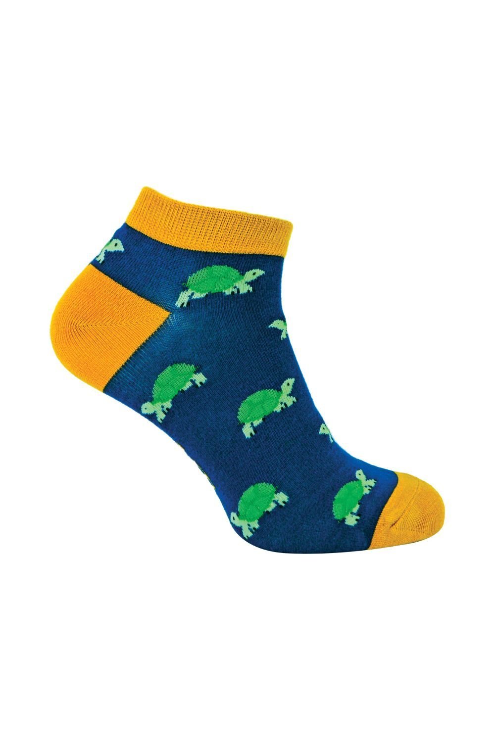 Novelty Bamboo Animal Trainer Socks in navy with a playful turtle print. Made from a blend of cotton, polyester, and elastane for comfort and durability. Ideal for casual wear.