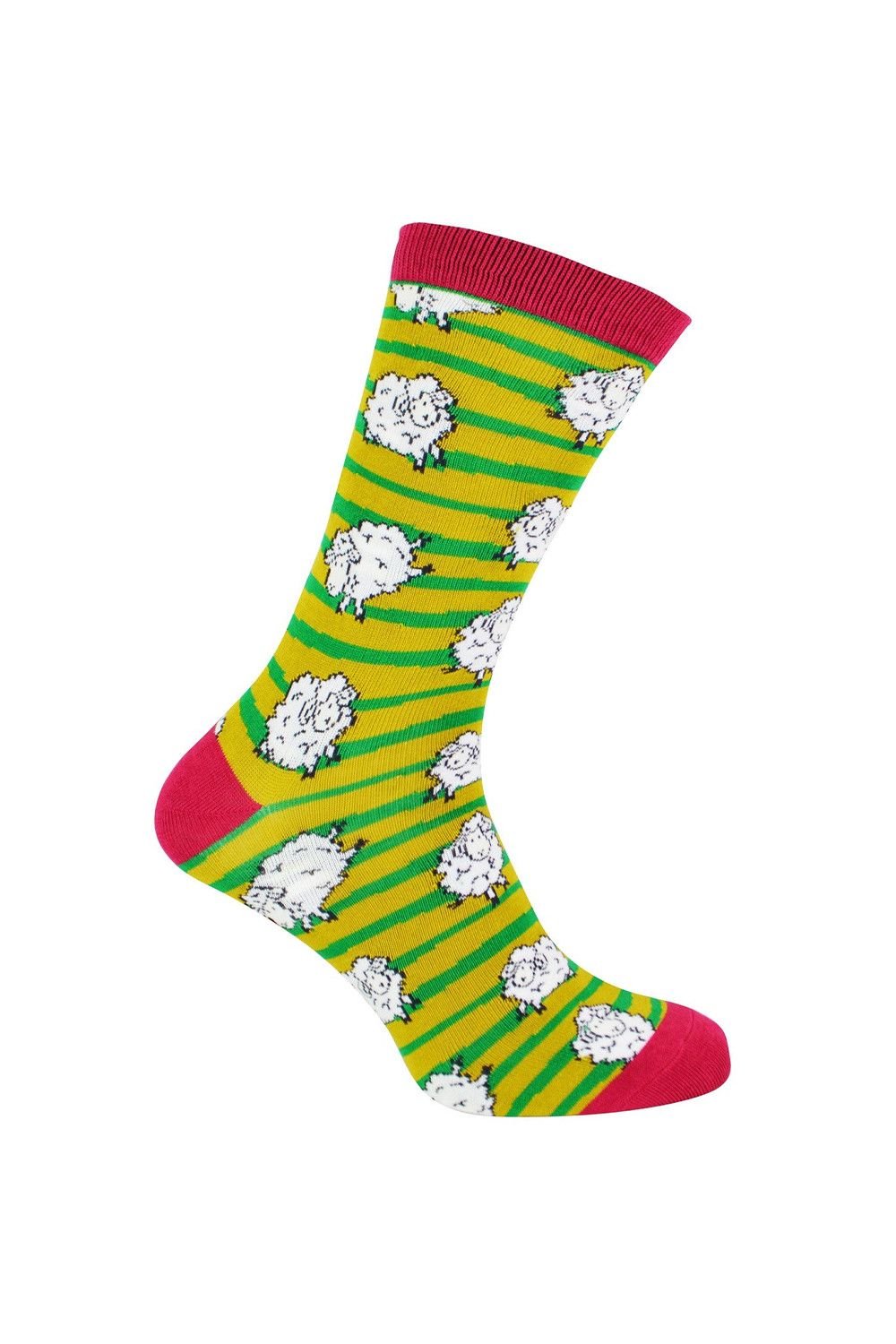 Novelty socks in pale green and yellow with a playful sheep pattern. Made from a soft, breathable bamboo fabric blend, perfect for everyday wear.
