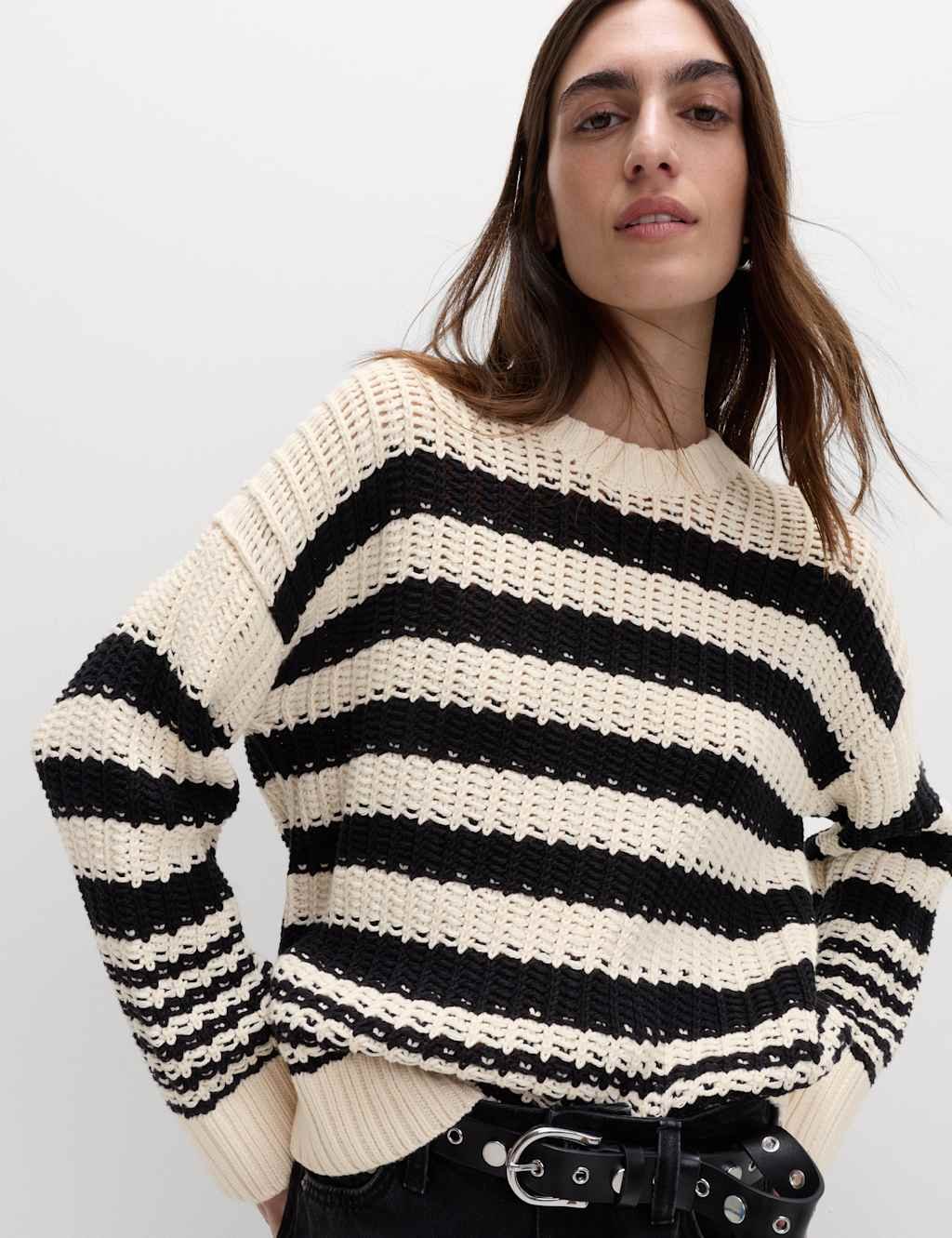 The M&S Black Mix Cotton Rich Striped Jumper is ideal for casual, everyday, date-night.