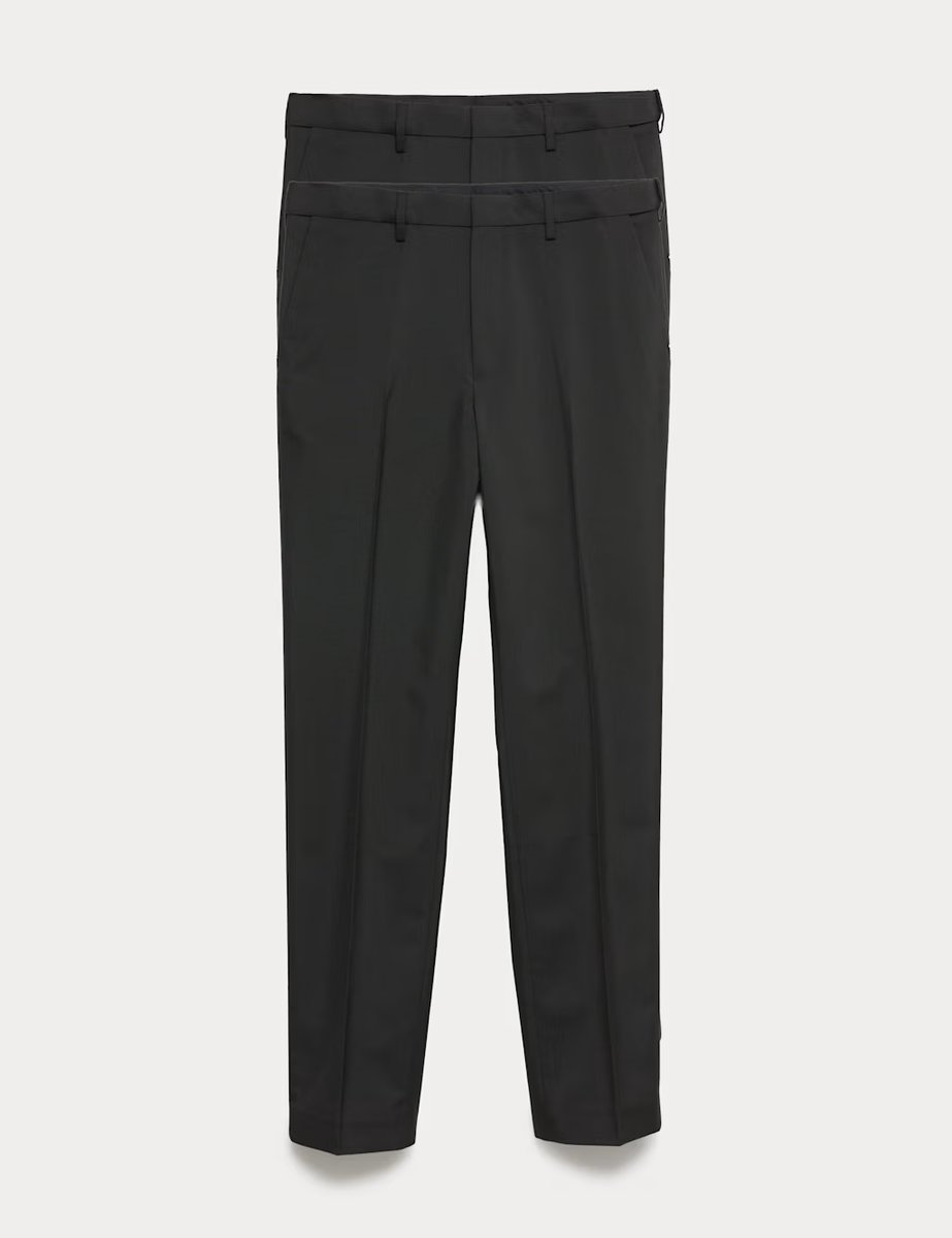 These smart trousers are crafted with an active waist that moves with you and gives a perfect fit. They're made in a sleek flat-fronted style, with a hook bar and zip fastening. Kick tape detailing at the hems helps prevent wear and tear. This handy two-pack is made from wrinkle-resistant fabric to keep creases at bay.