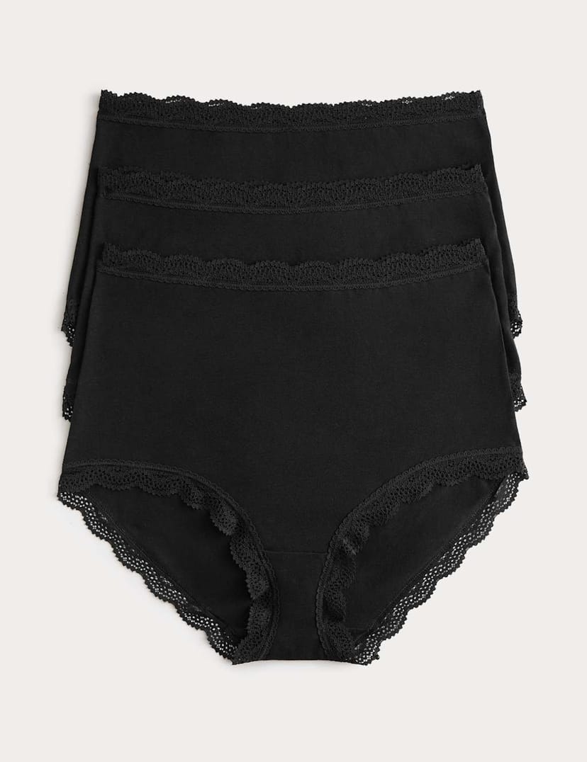 View Marks & Spencer's returns policyDiscover the comfort of M&S's 3-pack black cotton-rich full briefs. Featuring a full coverage style with a flattering high waist and lace trims for a delicate touch. Perfect for everyday wear.