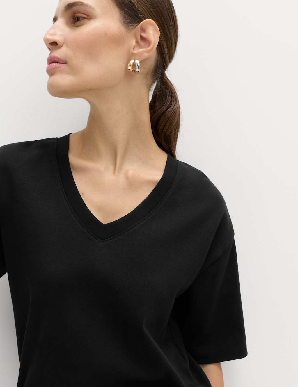 Designed in black, this V-neck top features a boxy shape and dropped shoulders for a laid-back look. Made from pure cotton, it offers a relaxed fit and a flattering neckline.