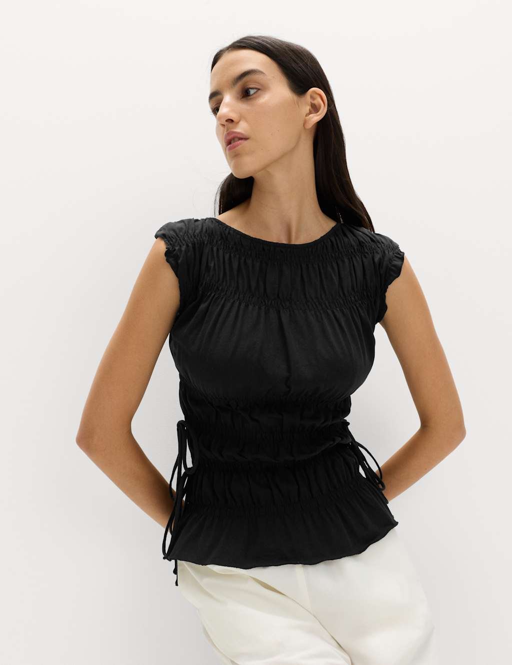The M&S Pure Cotton Smocked Detail Top in Black is ideal for work, business, casual.