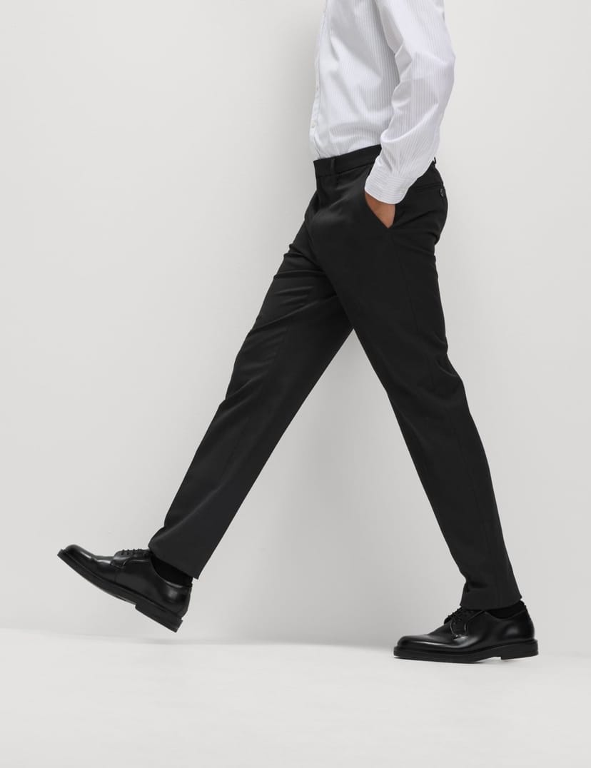 Modern slim fit trousers in black with a subtle taper for a sleek look. Made from twill fabric with stretch for comfort and ease of movement. Features include kick tape to prevent scuffing and a concealed hook and zip fastening.