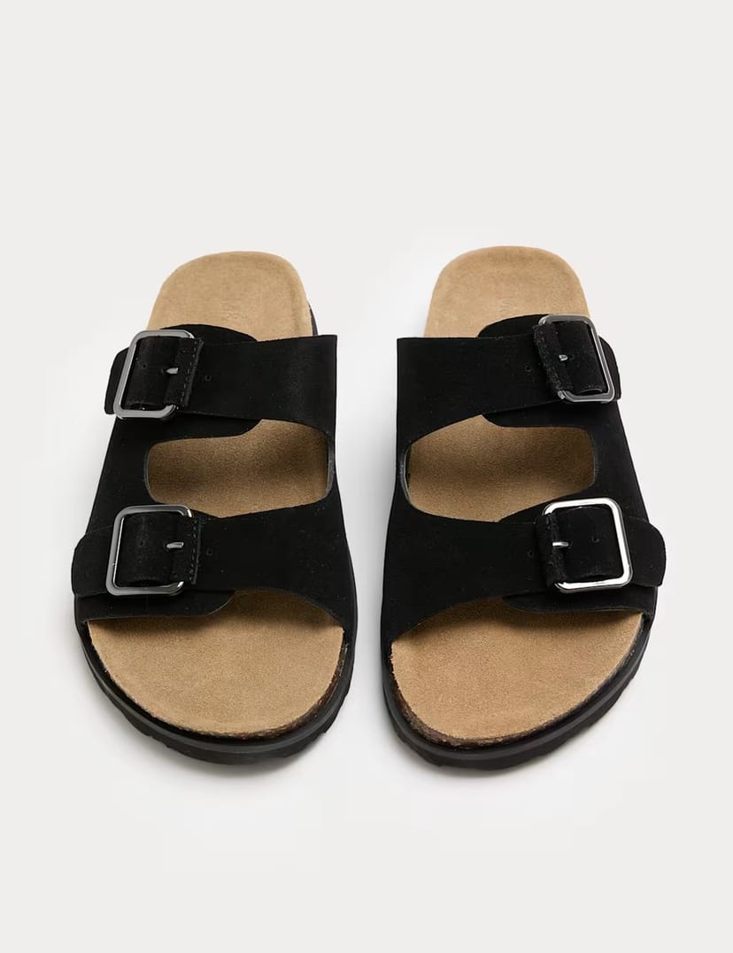 The M&S Suede Double Buckle Footbed Mules Black is available in sizes 3, 4, 5, 6, 7, 8.