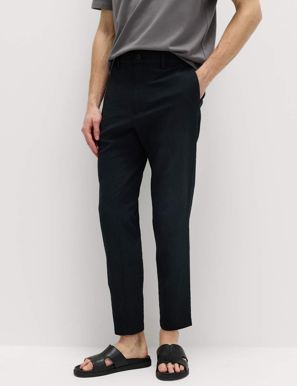 The M&S Tapered Fit Cotton Rich Seersucker Trousers in Black is made from cotton, elastane.