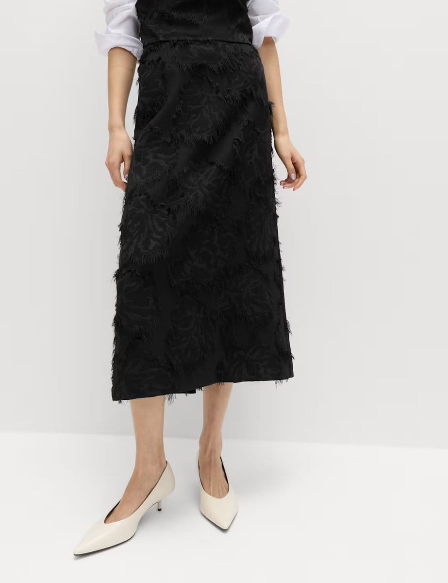 “Pair with a plain blouse and heels for an elegant evening look.”