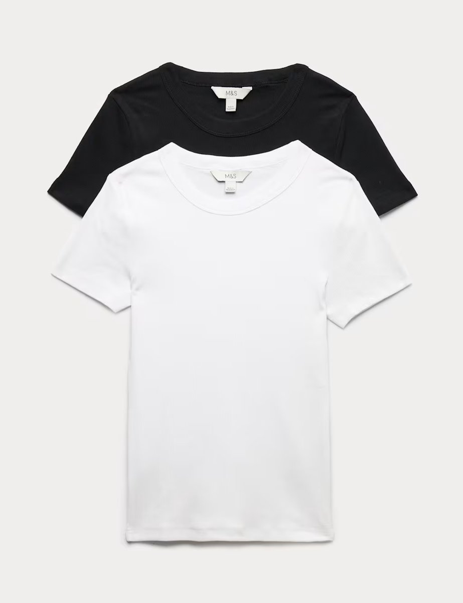 The M&S Slim Fit Cotton-Rich Ribbed T-Shirts Pack in Black/White is available in sizes 10, 12, 14, 16, 18, 20, 22, 24, 6, 8.