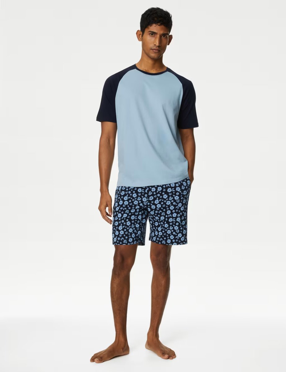 Sleep in style with this soft, breathable pure cotton pyjama set. Featuring a short-sleeved raglan top and floral-print shorts with a covered elasticated waistband, secure drawstring fastening, and handy side pockets. Perfect for easy-to-wear nightwear.