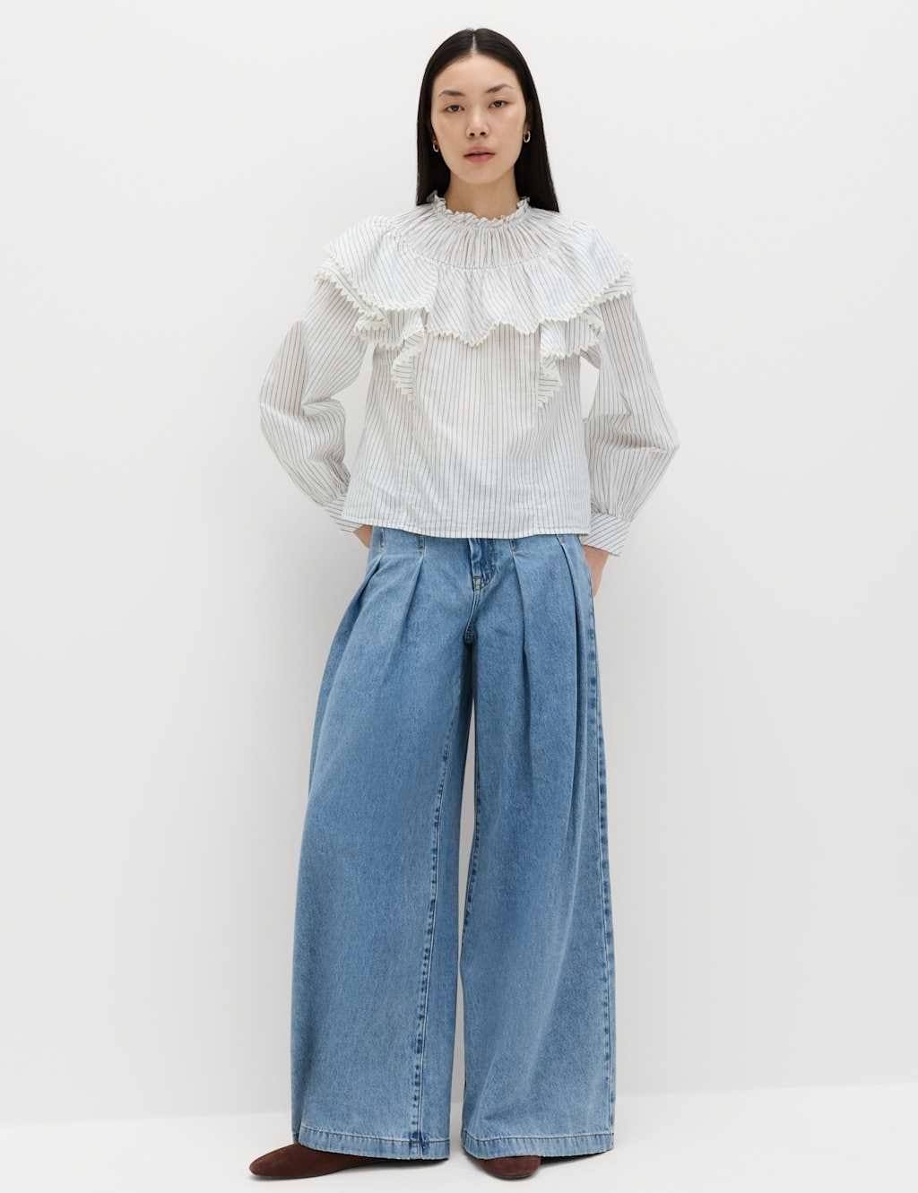 View Marks & Spencer's returns policyThis M&S pure cotton blouse features a regular fit with a high frilled neckline. The long sleeves end in elasticated cuffs for comfort. Its striped print is enhanced by ruffled detailing and lace inserts. Perfect for casual and smart-casual occasions.