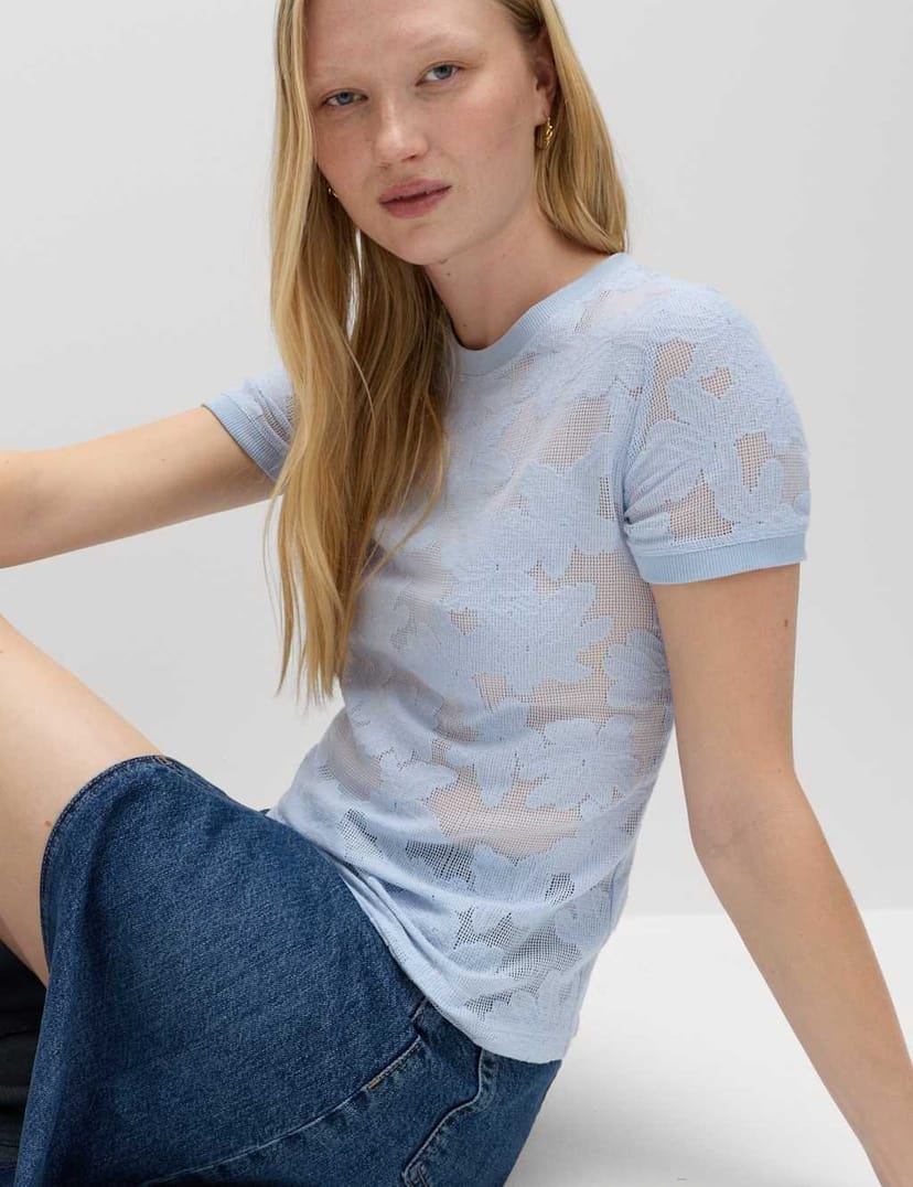 This light blue cotton-blend top brings a dose of feminine flair to your sunny-day looks. It's cut to a regular fit, with a timeless crew neck and short sleeves. The design features a floral lace overlay for a stylish finish.
