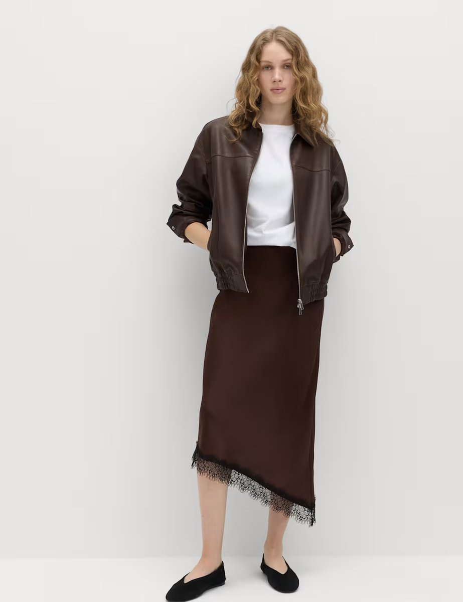 The M&S Asymmetric Midi Slip Skirt with Lace Detail in Brown is available in sizes 10, 12, 14, 16, 18, 20, 22, 24, 6, 8.