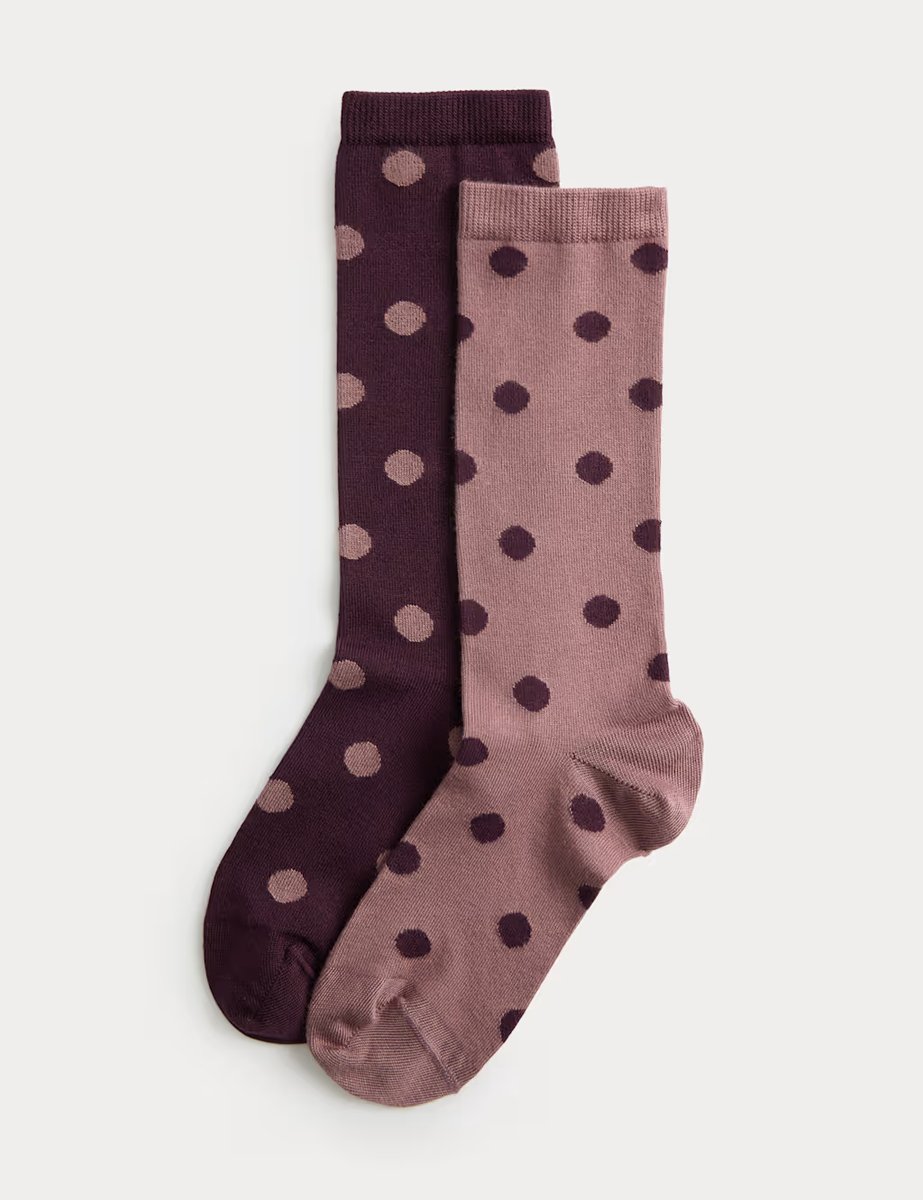The M&S 2 Pack Supersoft Spot Print Crew Socks in Burgundy Mix is ideal for casual.