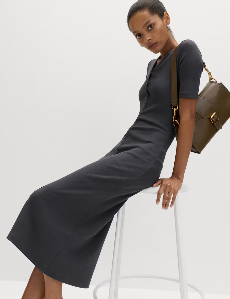 The M&S Cotton Rich Ribbed V-Neck Midi Column Dress in Charcoal is available in sizes 10, 12, 14, 16, 18, 6, 8.