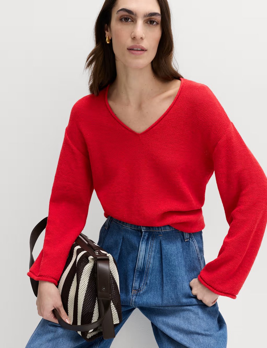 Create versatile layered looks with this textured cotton blend, slim fit jumper. It's designed with a timeless v-neckline and broad hem. Long, slightly fluted sleeves add an elegant finish.