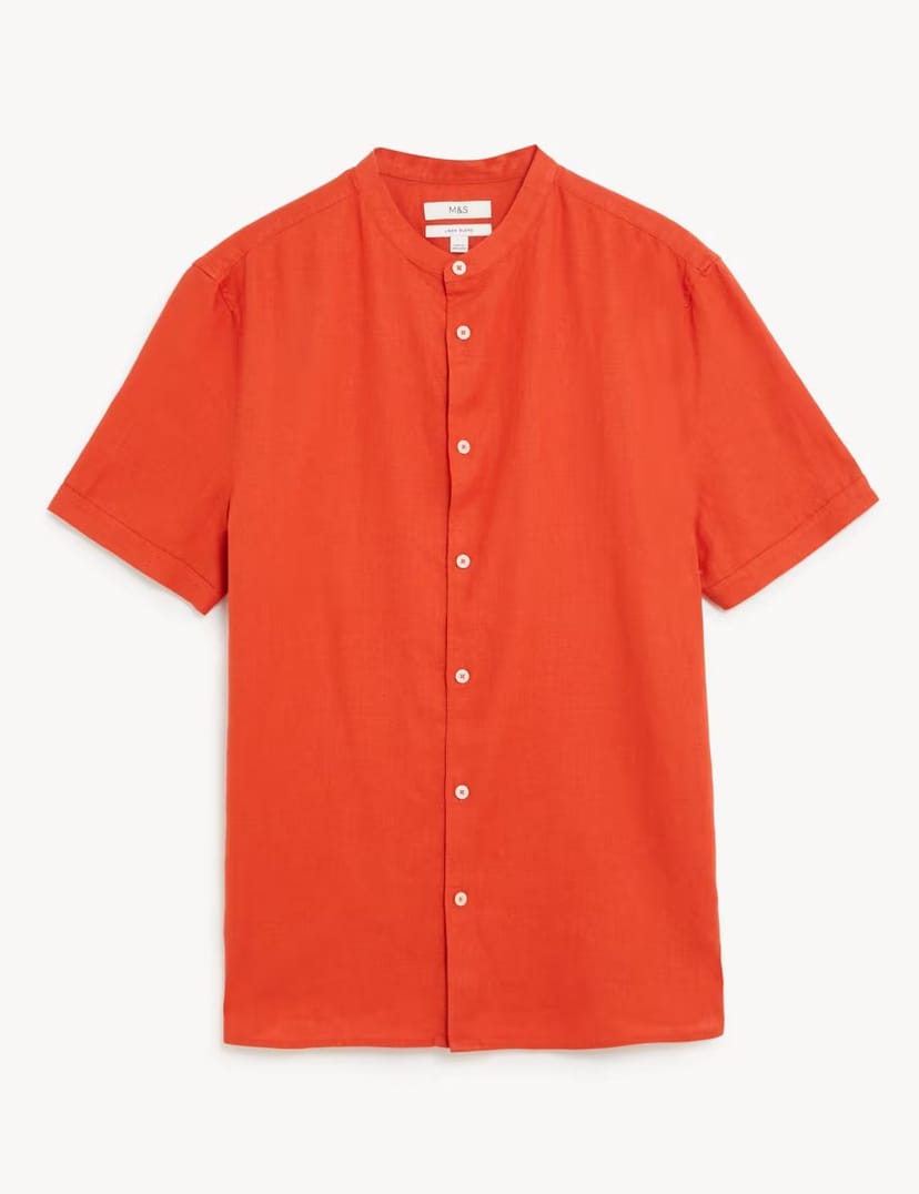 The M&S Grandad Collar Linen Shirt in Copper is available in sizes mreg.