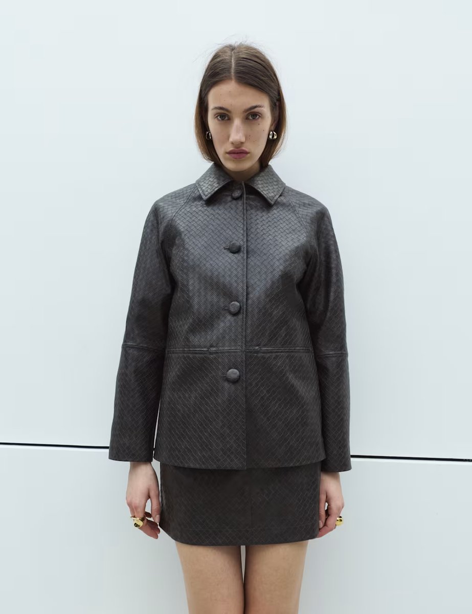Crafted from faux leather with a unique basket-style weave, this dark grey jacket boasts a regular fit, neat collar, and self-fabric button fastenings. It features two welt pockets for practicality, perfect for both casual and smart-casual occasions.