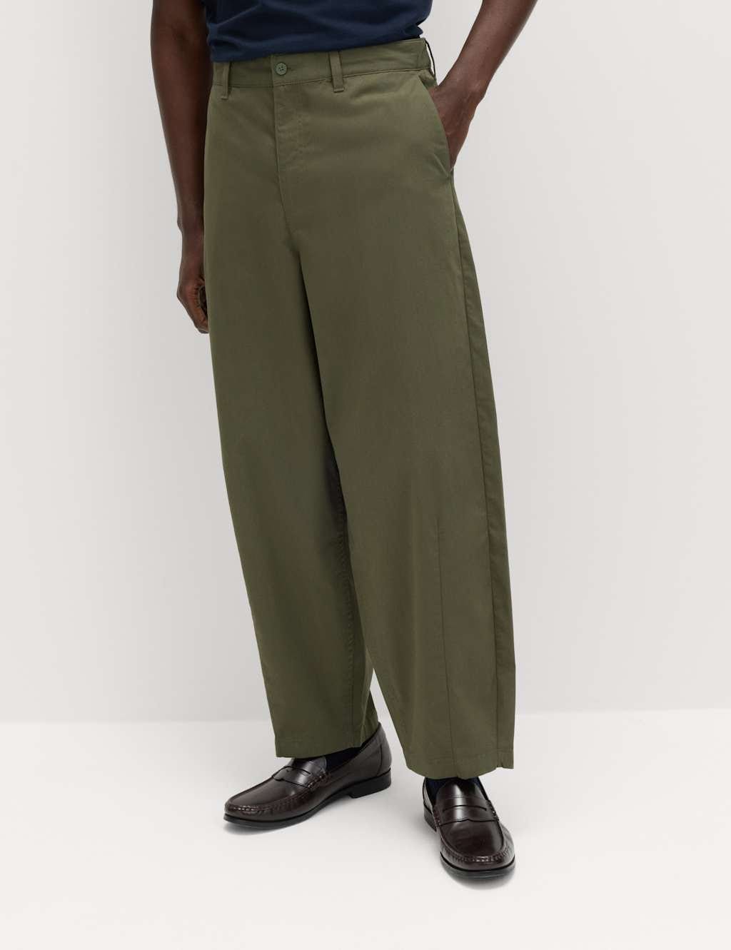Elegant dark khaki cotton trousers with a barrel fit and oversized legs that taper towards the ankles. Designed for a modern, on-trend look with added stretch for easy movement.